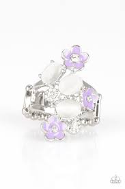 Featuring glowing white moonstones, shiny purple daisies and glittery white rhinestone flowers dance across the finger for a seasonal look. Features a stretchy band for a flexible fit.