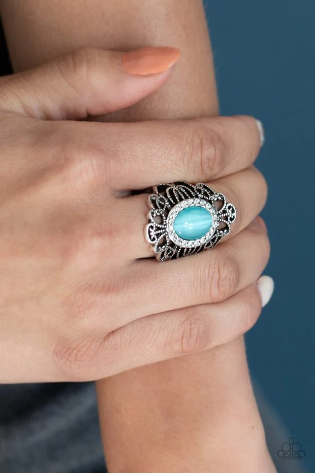 Ringed in glassy white rhinestones, a dewy blue cat's eye stone is pressed into the center of a frilly silver frame swirling with studded filigree. Features a stretchy band for a flexible fit. Sold as one individual ring.