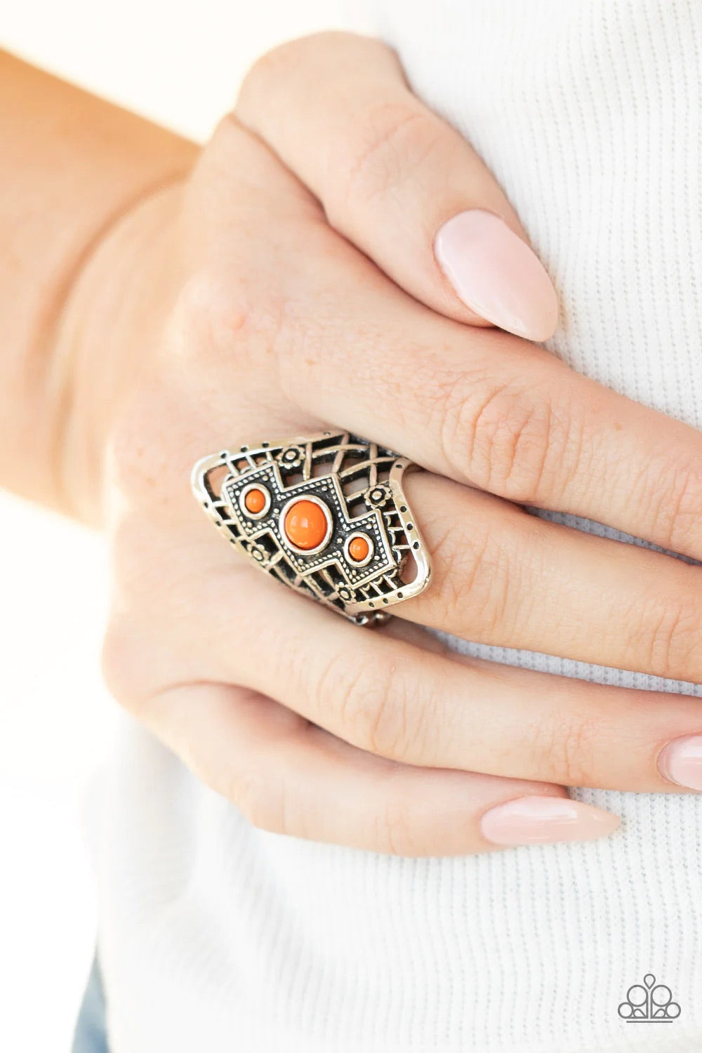 A trio of dainty orange beads dot the center of an antiqued silver frame radiating with shiny floral details and an airy crisscrossed backdrop. Features a stretchy band for a flexible fit.