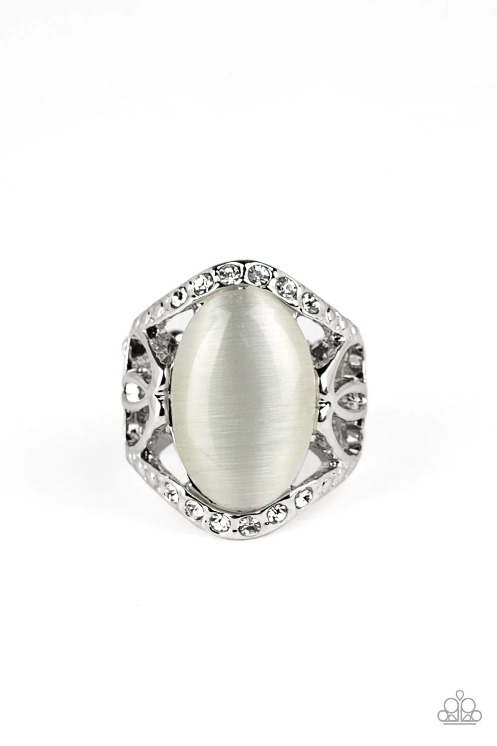 A dewy white cat's eye stone is pressed into the center of an ornate silver frame dotted in sections of glassy white rhinestones, creating a whimsical centerpiece atop the finger. Features a stretchy band for a flexible fit.