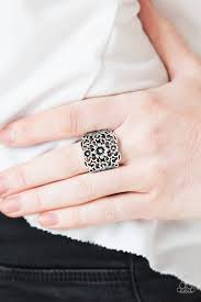 Brushed in an antiqued shimmer, glistening silver daisies bloom across the finger, creating a whimsical floral frame. Features a stretchy band for a flexible fit.