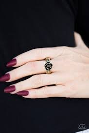 Etched in lifelike textures, shimmery brass petals bloom from the center of a serrated brass band, creating a radiant floral frame. Features a dainty stretchy band for a flexible fit.