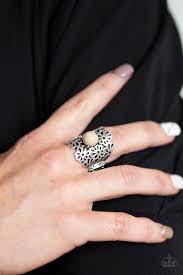A collection of airy silver flowers coalesce into a thick silver band. A polished Soybean bead dots the center, adding a perfect pop of color to the seasonal piece. Features a stretchy band for a flexible fit.