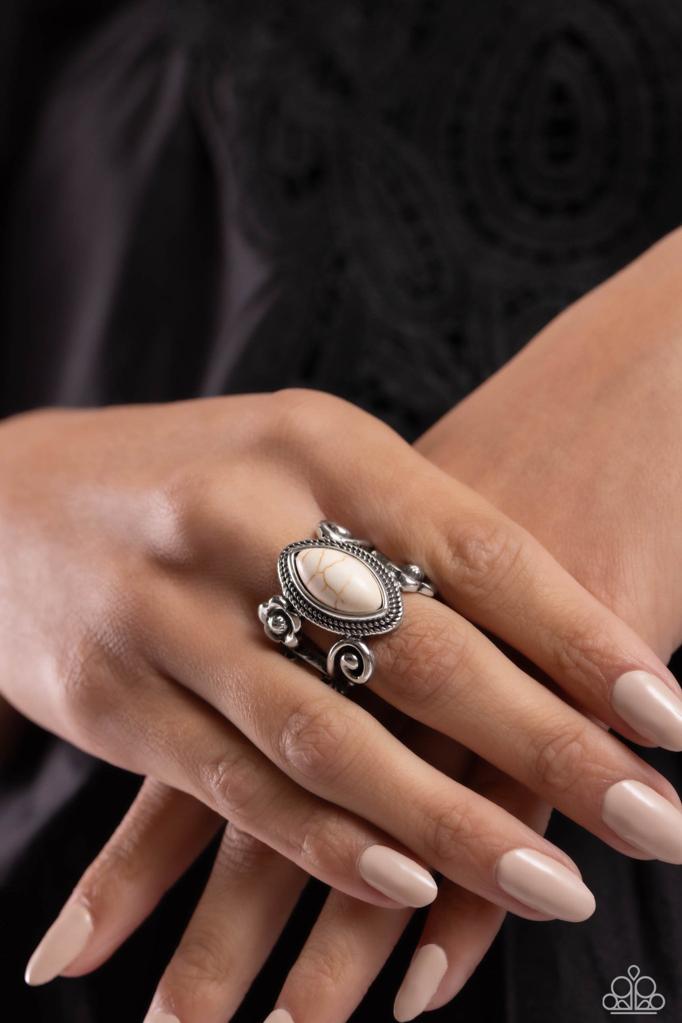 Pressed in a rope-textured silver frame, a vivacious marquise-cut white stone rests atop the finger on airy silver bands. Silver floral and silver swirl accents arc across the airy bands for a whimsical finish. Features a stretchy band for a flexible fit. As the stone elements in this piece are natural, some color variation is normal.