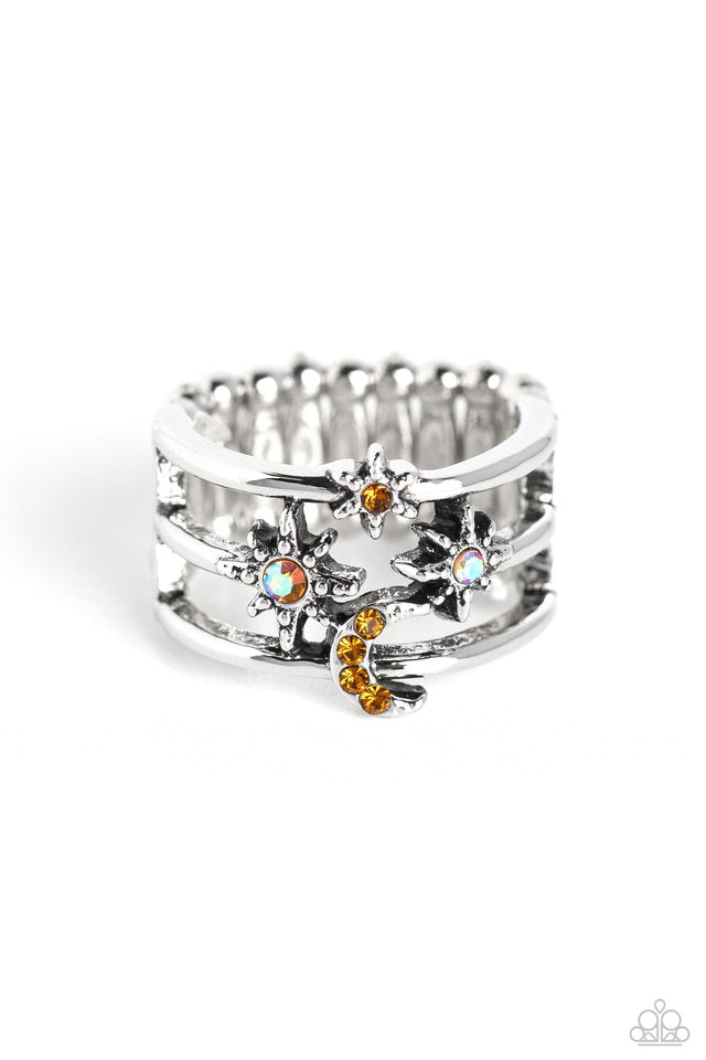 Featuring orange rhinestones and an iridescent shimmer, three-dimensional stars, and a crescent moon dot across three sleek silver bands that meet in the center of the finger, creating a sparkling out-of-this-world centerpiece. Features a stretchy band for a flexible fit. Due to its prismatic palette, color may vary.