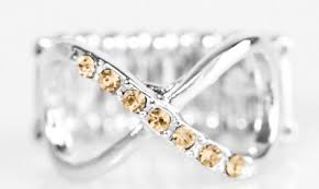 A glistening silver bar delicately bends and weaves into an elegant infinity charm. A row of brown rhinestones is added to the display for a refined sparkle.