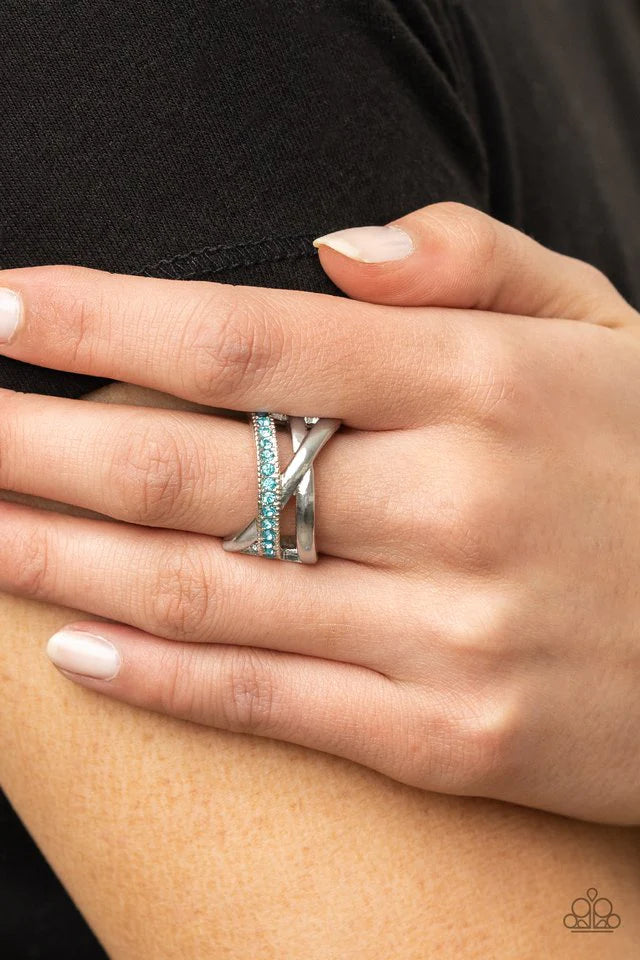 Bands of crisscrossing shining silver rows are highlighted by a row of glittering Aquamarine rhinestones for a ritzy finish across the finger. Features a stretchy band for a flexible fit.