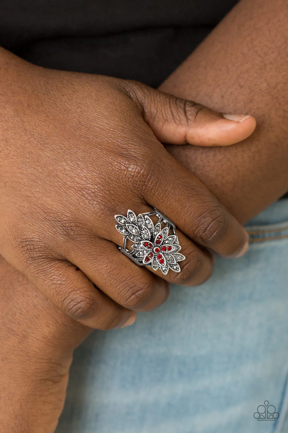 Encrusted in dainty hematite rhinestones, marquise shaped silver frames layer across the finger. Sprinkled in glittery red rhinestones, a sparkling flower blooms atop the frame for a whimsical finish. Features a stretchy band for a flexible fit.