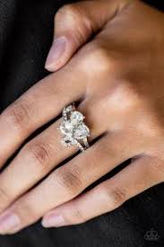 Three white teardrop rhinestones join atop two silver bands, creating a regal centerpiece. Encrusted in glassy white rhinestones, one silver band loops across the finger for a stunning finish. Features a dainty stretchy band for a flexible fit.