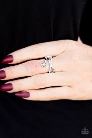 Encrusted in sections of glittery white rhinestones, a glistening ribbon of silver wraps around the finger. A classic silver pearl dots the end of the swooping bar, adding a refined finish to the timeless look. Features a dainty stretchy band for a flexible fit.