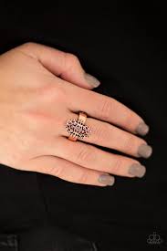 Brushed in an antiqued finish, glistening copper filigree whirls across the finger for an airy look. Features a dainty stretchy band for a flexible fit.