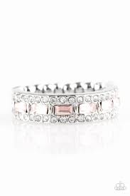 Featuring classic round and regal emerald style cuts, glassy white and glittery pink rhinestones are encrusted along with a dainty silver band for a refined look. Features a dainty stretchy band for a flexible fit.