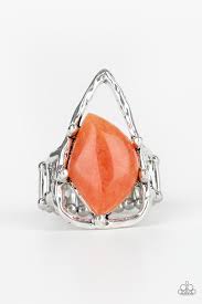 An abstract orange stone is nestled inside a hammered silver triangle, creating an artisan inspired frame atop the finger. Features a stretchy band for a flexible fit.