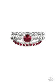 White and red rhinestone encrusted bands arc across the finger, coalescing into a layered band. A glittery red rhinestone dots the upper band, creating a refined centerpiece. Features a dainty stretchy band for a flexible fit.