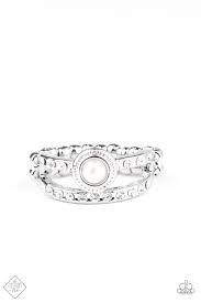 Two skinny silver bars decorated in tiny white rhinestones run parallel to each other, creating a layered band. A tiny white pearl encircled by a classic silver frame sits atop one of the silver bars, creating a refined centerpiece. Features a dainty stretchy band for a flexible fit.