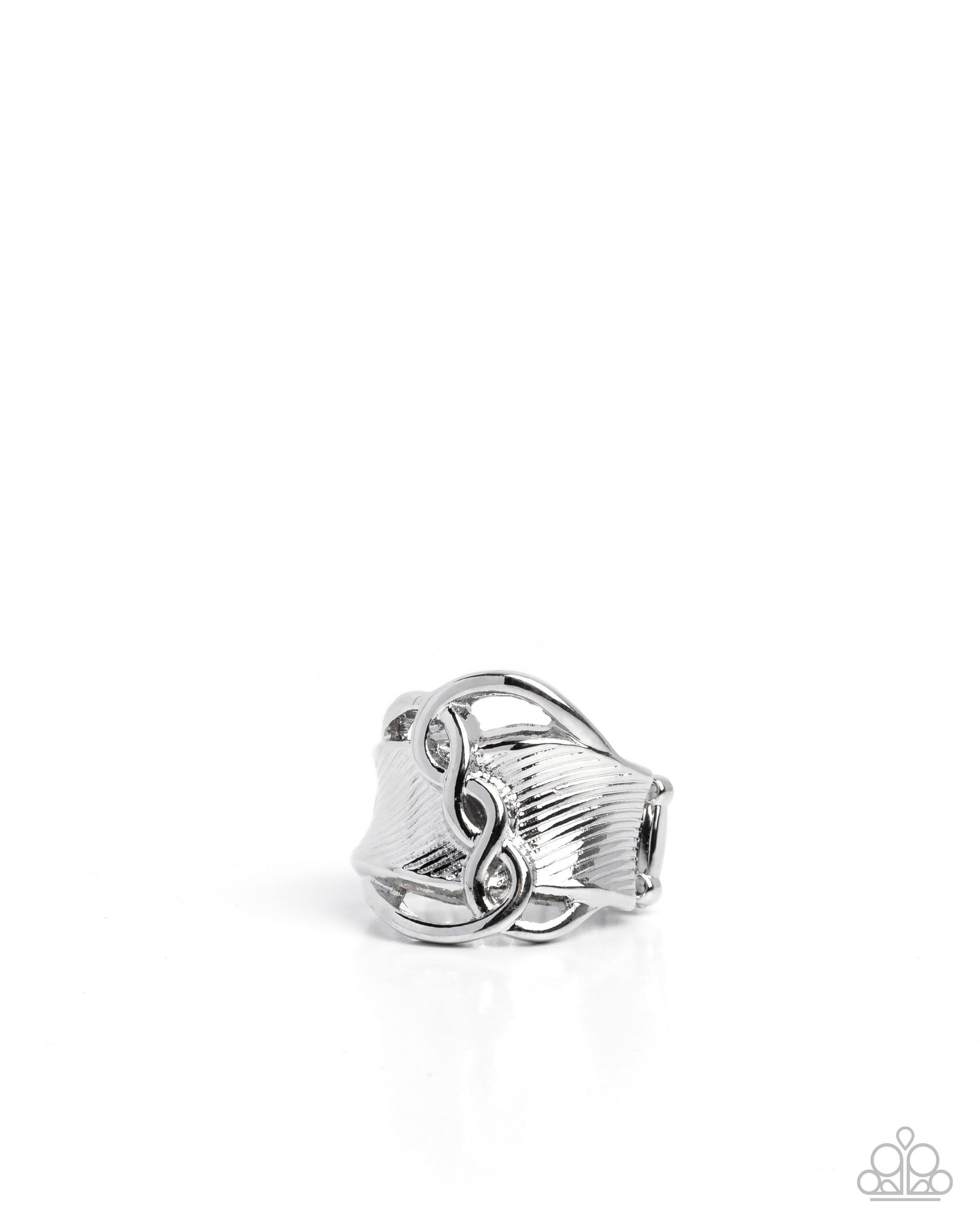 Sleek silver bands intertwine gracefully along the center of the finger creating helix-inspired loops through a silver-brushed delicate frame for a timelessly sophisticated centerpiece. Features a stretchy band for a flexible fit.