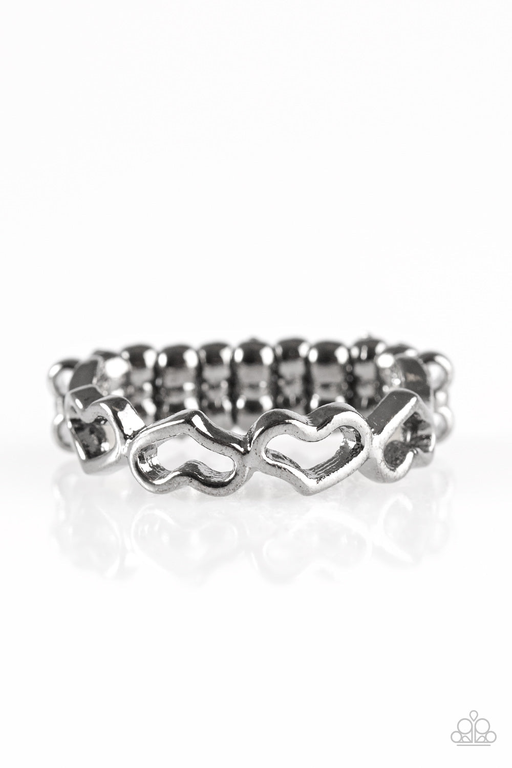 Airy gunmetal heart silhouettes connect across the finger, creating a romantic band. Features a dainty stretchy band for a flexible fit.
