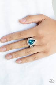 A glassy blue teardrop gem is pressed into a glistening silver frame encrusted in dainty white rhinestones, creating a glamorous frame atop the finger. Features a dainty stretchy band for a flexible fit.