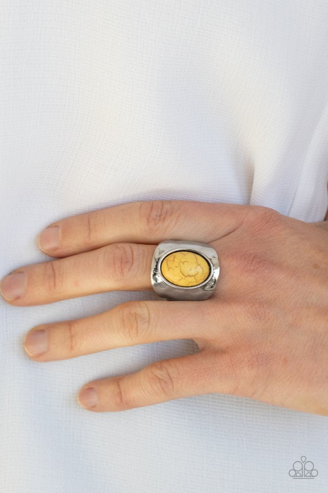 An oval yellow stone is pressed into the center of a hammered silver band, creating a vivacious seasonal piece atop the finger.