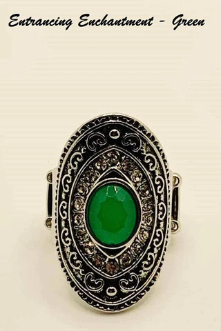 Bordered in glassy white rhinestones, a dewy Leprechaun rhinestone is pressed into the center of an oval silver frame embossed in frilly filigree, creating an ethereal centerpiece atop the finger. Features a stretchy band for a flexible fit. Sold as one individual ring.