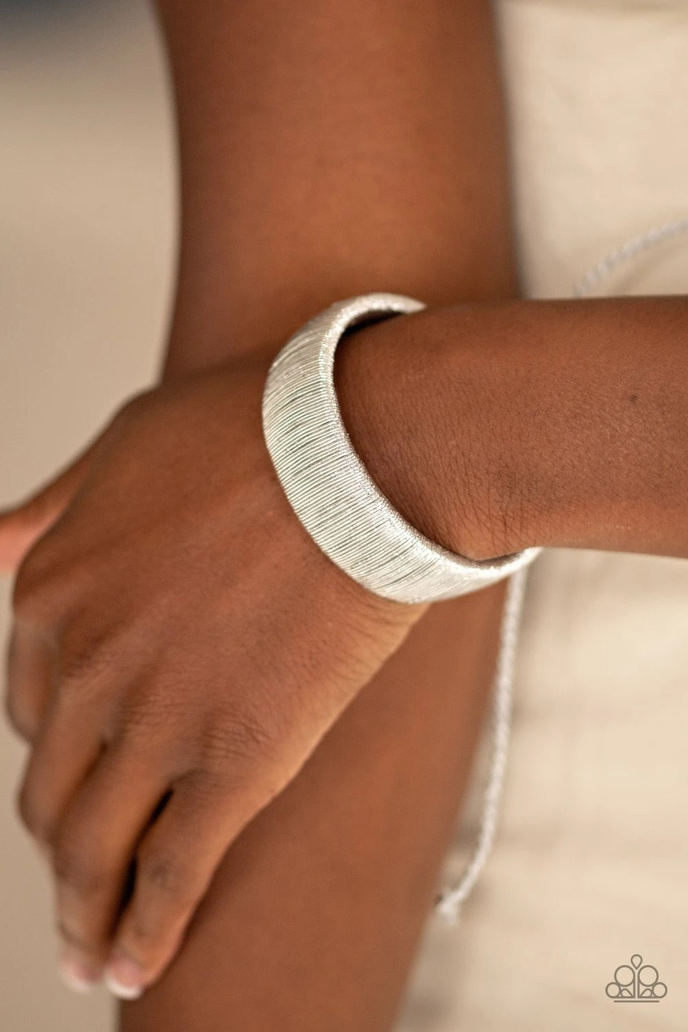 Brushed in a metallic-like finish, shimmery silver wire wraps around a thick black leather band for an edgy look around the wrist. Features an adjustable sliding knot closure.