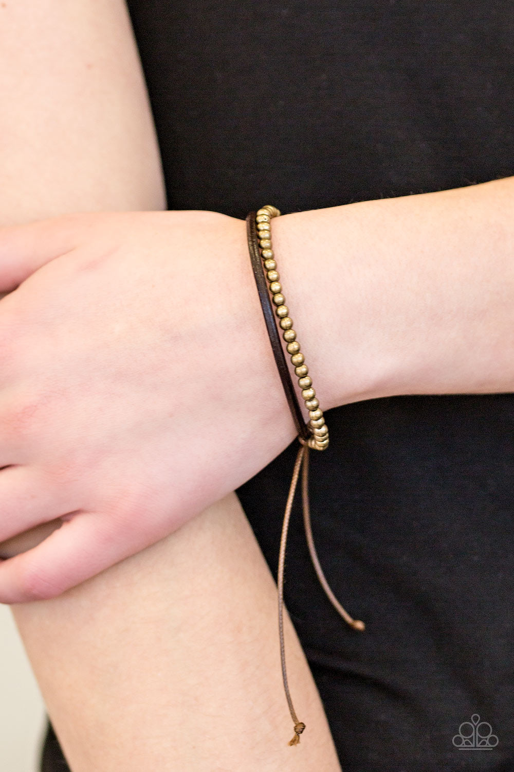 A strand of glistening brass beads and a strand of shiny brown leather cording wrap around the wrist, creating dainty layers. Features an adjustable sliding knot closure.