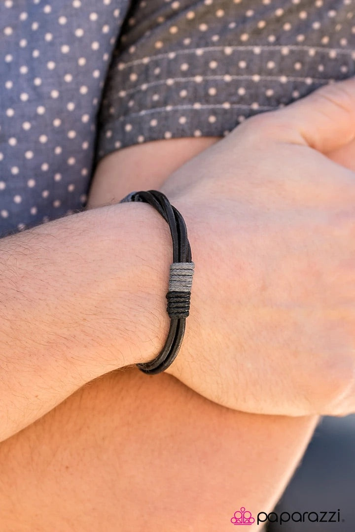 Black and gray twine knots around strips of leather, creating urban accents. Features an adjustable sliding knot closure.