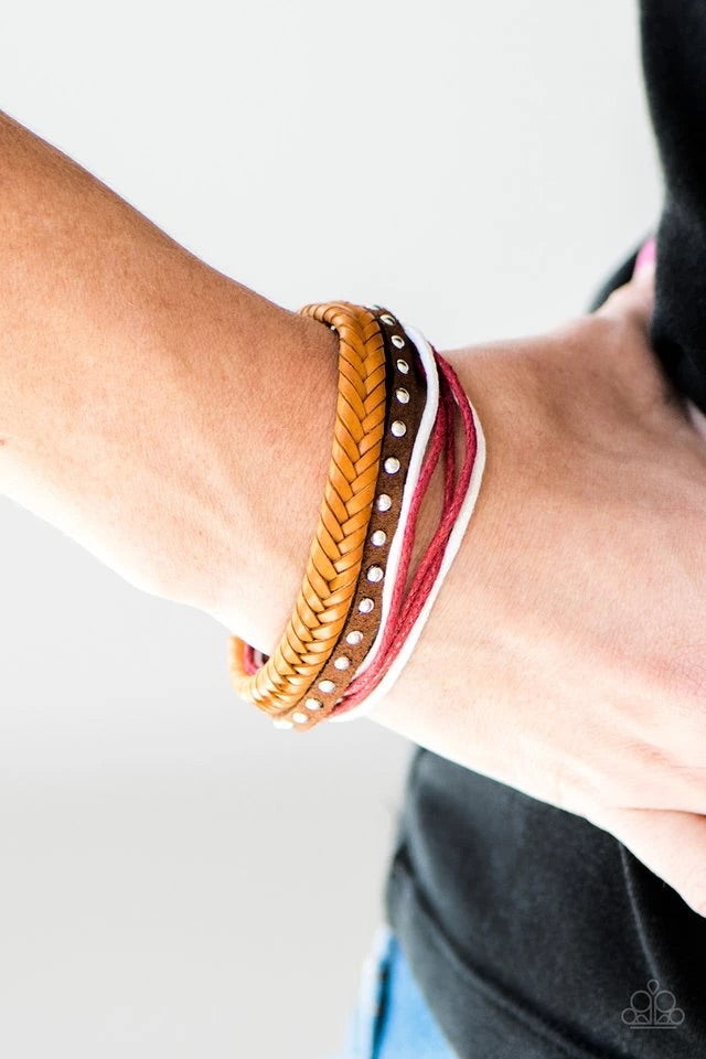 Strands of red and white cording, a strand of silver studded suede, and a braided leather band stack across the wrist in a colorful urban fashion. Features an adjustable sliding knot closure.