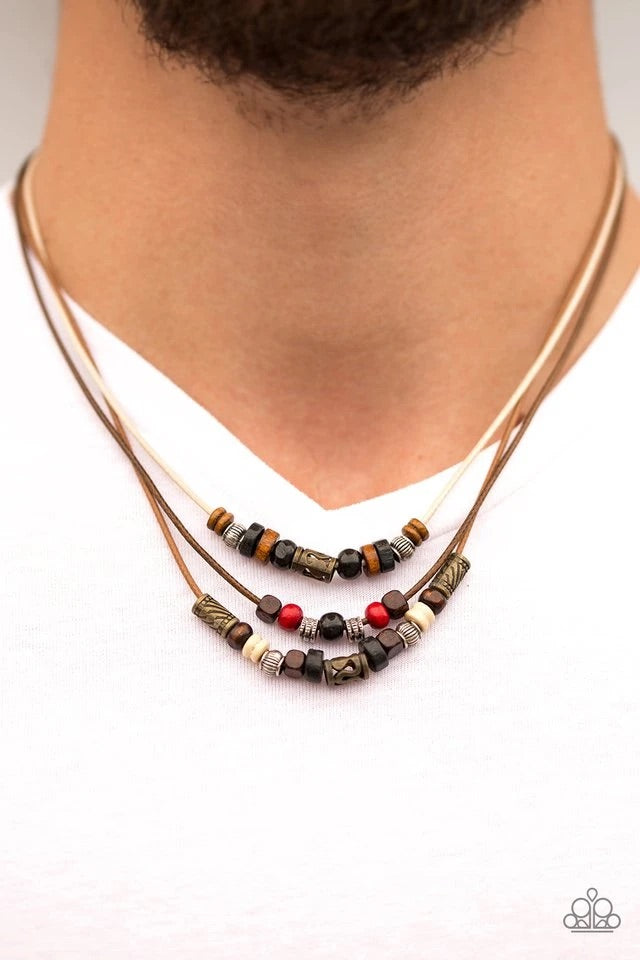Multicolored wooden beads and an array of mixed metallic accents are threaded along strands of brown, tan, and white string, creating a colorfully layered palette below the collar. Features a button loop closure. Sold as one individual necklace.
