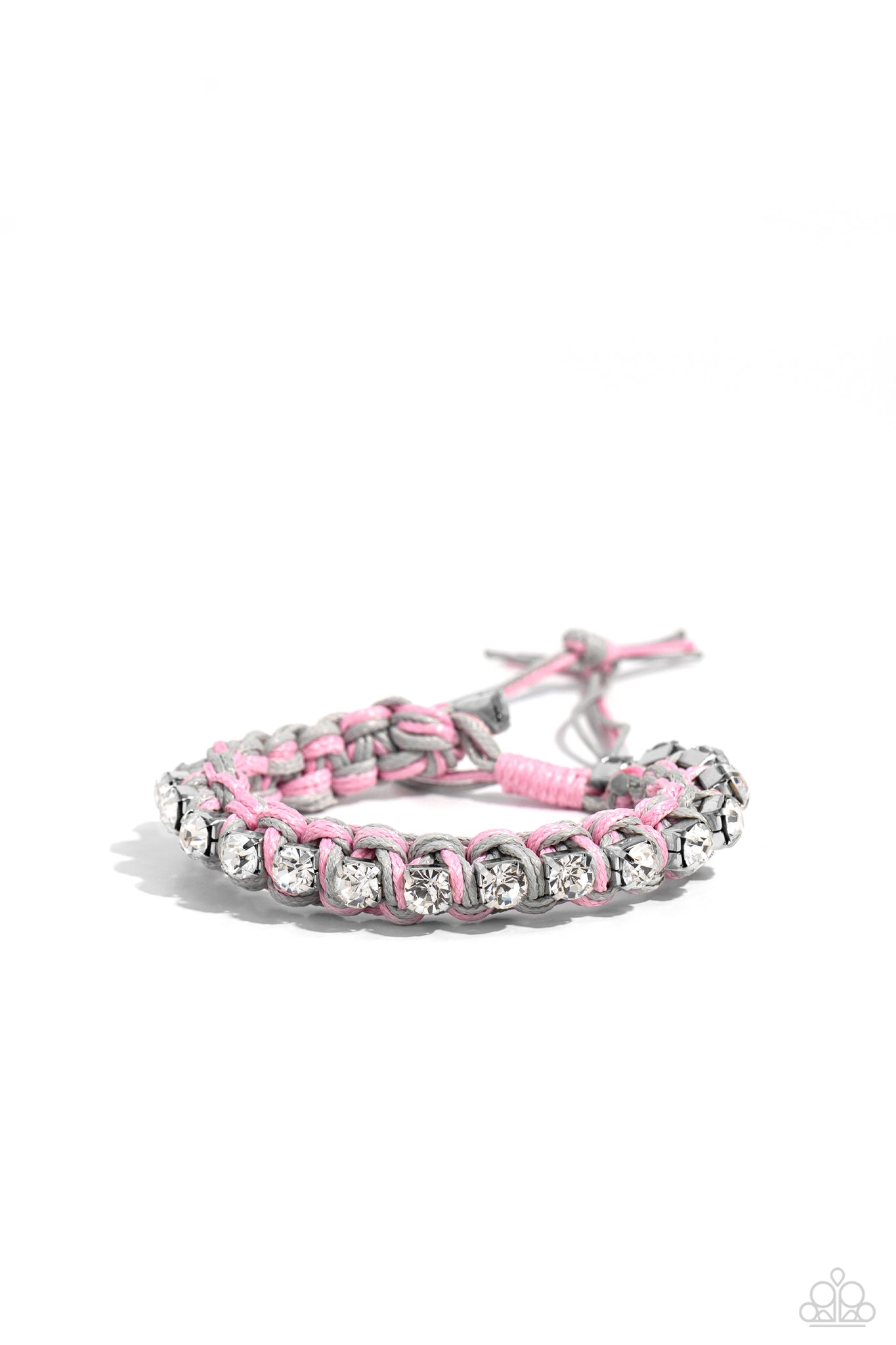 Strands of gray and pink cording ornately weave across the wrist, creating an earthy braid. Sporadically dotted through the cording, white rhinestones, set in silver square fittings add a bit of lively dazzle to the colorful design. Features an adjustable sliding knot closure.