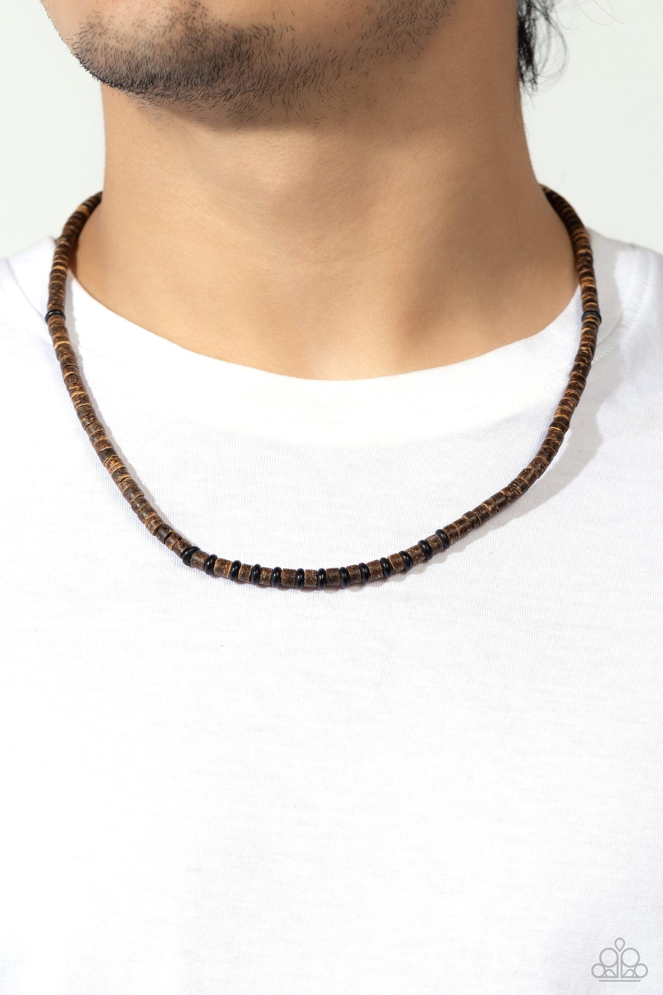 Threaded along an invisible wire, brown wooden beads and black stone discs haphazardly coalesce down the neckline for an earthy finish. Features an adjustable clasp closure. As the stone elements in this piece are natural, some color variation is normal.