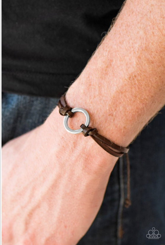 Skinny leather strands knot around a shimmery silver hoop, creating a casual urban centerpiece. Features an adjustable sliding knot closure. Sold as one individual bracelet.