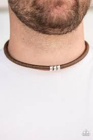 Shiny brown twine wraps around a black cord, creating an urban look below the collar. Shiny silver beads slide along the cording for a rugged finish. Features a button loop closure. Sold as one individual necklace.