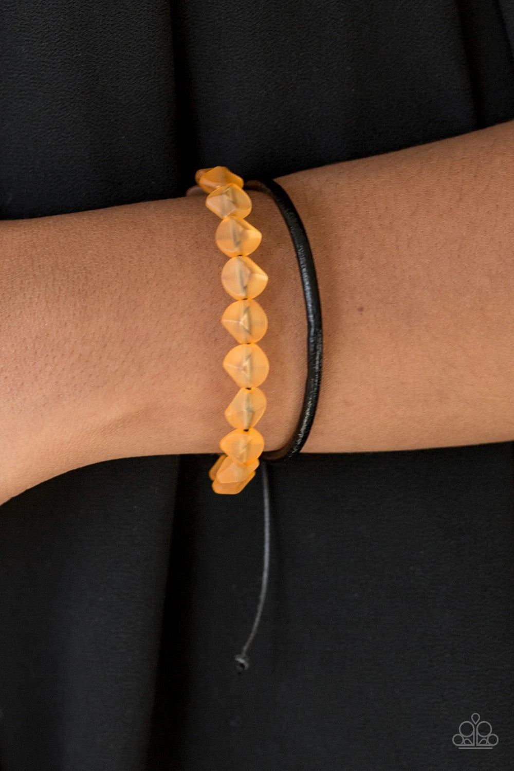 A strand of faceted orange beads and a strand of shiny leather cording wrap around the wrist, creating dainty layers. Features an adjustable sliding knot closure.