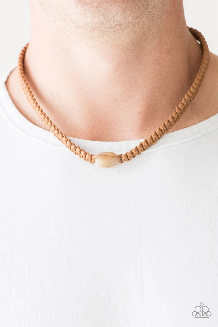 Braided brown cording knots around a cloudy bead, creating an edgy pendant. Features a button loop closure.