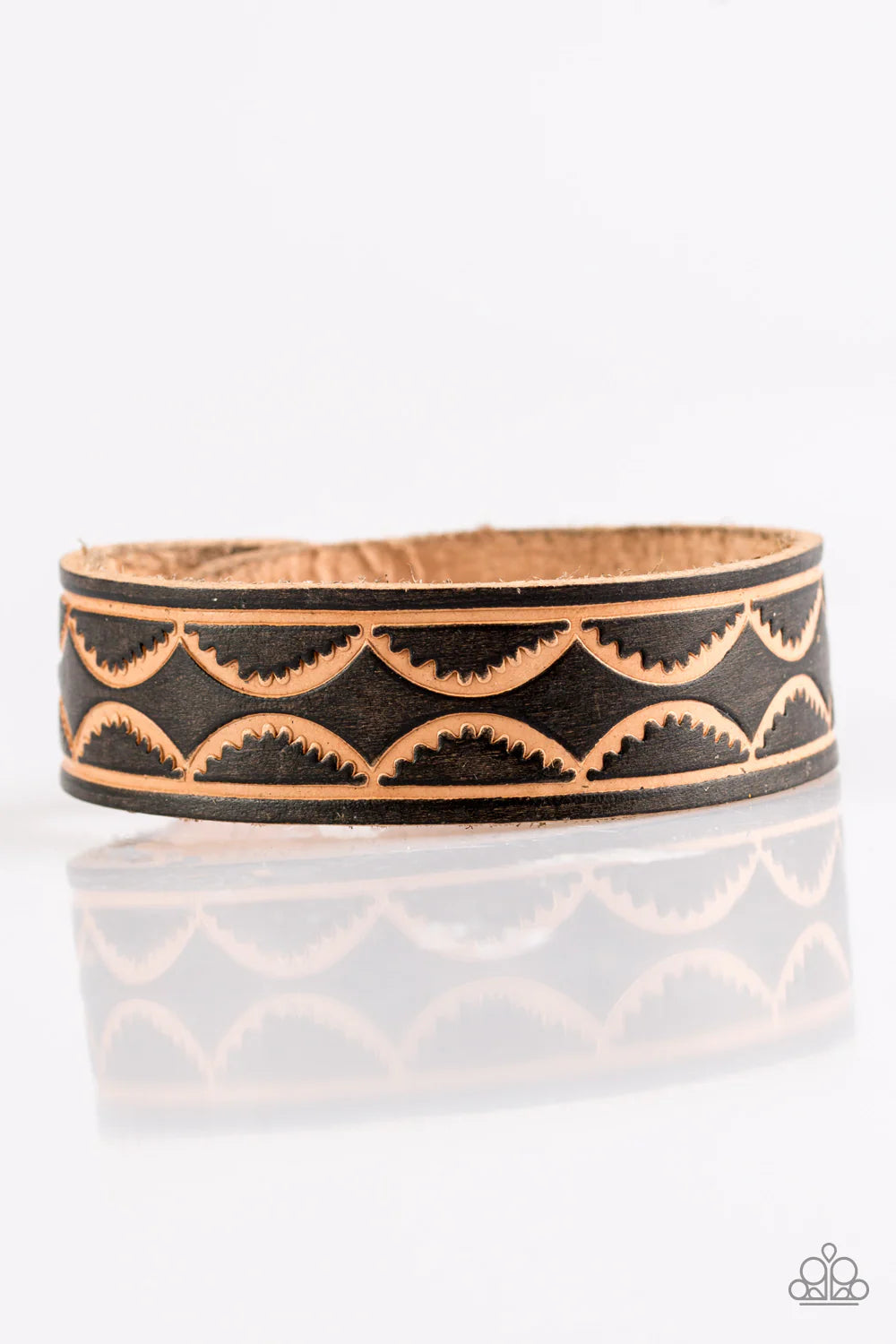A strip of leather is stamped in a scalloped pattern for an earthy look. Features an adjustable snap closure.
