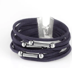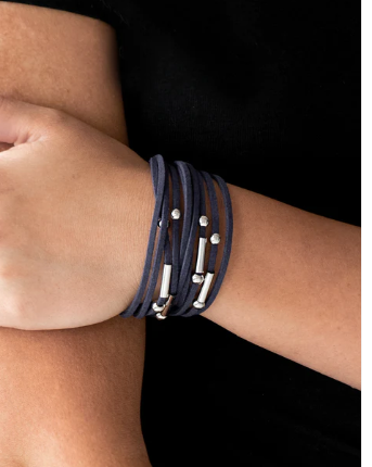 Dainty silver beads and shiny silver accents slide along rows of refreshing blue suede for a seasonal look. Features an adjustable clasp closure.