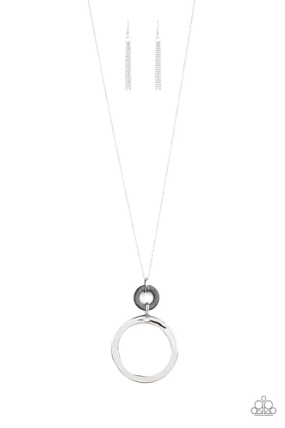 Featuring a delicately hammered finish, an oversized silver hoop links with an earthy black stone ring at the bottom of a lengthened silver chain for a sophisticated look. Features an adjustable clasp closure.