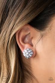 Dainty silver pearls and glassy white rhinestones coalesce into a bubbly frame for a timeless look. Earring attaches to a standard clip-on earring.