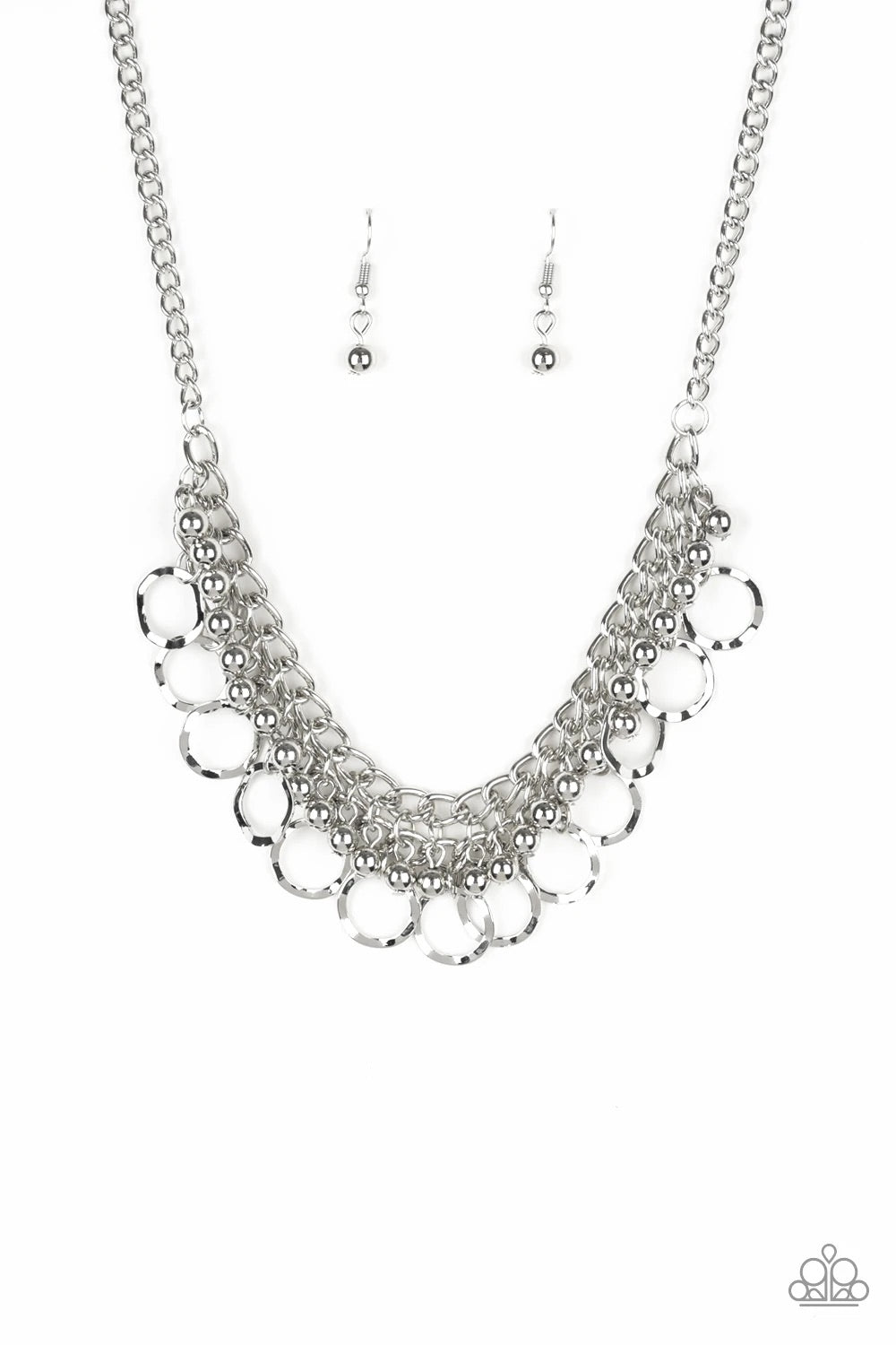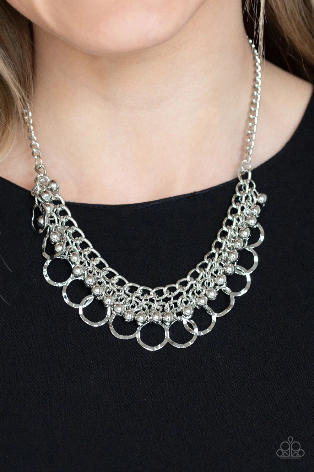 Rows of shiny silver beads and hammered rings swing from the bottom of interlocking silver chains, creating a bold fringe below the collar. Features an adjustable clasp closure.