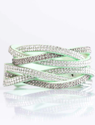 A strip of refreshing green suede is spliced into glittery strands. Dainty white and smoky rhinestones interweave around the wrist, creating a mishmash of sparkle. The elongated design allows for a trendy double wrap around the wrist. Features an adjustable snap closure.