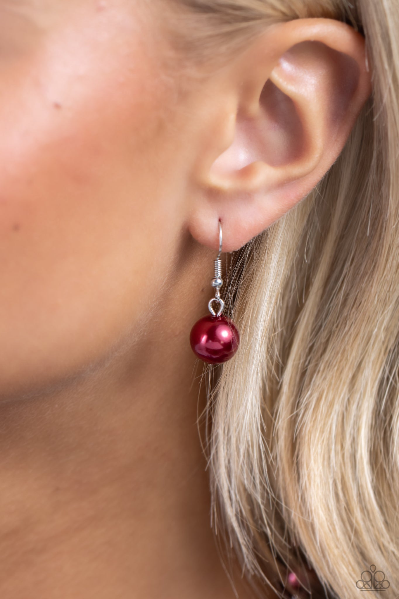 Red pearls trickle below the collar attaching to a silver hoop as it nears the center of the chest. Accented with oversized red pearls, rhinestone-encrusted silver beads, faceted clear beads, and strands of silver chains cascade from the bottom of the silver hoop creating a charming, refined display. Features an adjustable clasp closure.
