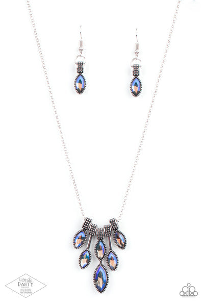 Featuring elegant marquise-cuts, sparkling iridescent gems cascade from a shimmery silver chain. Brushed in an antiqued shimmer, textured silver attaches to the dazzling gems, allowing the regal frames to delicately trickle just below the collar. Features an adjustable clasp closure.